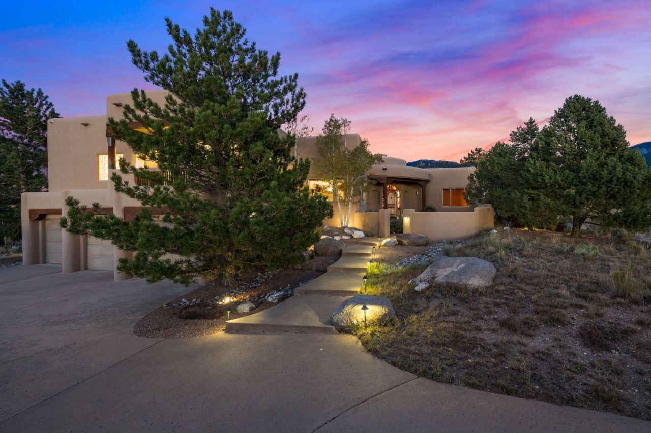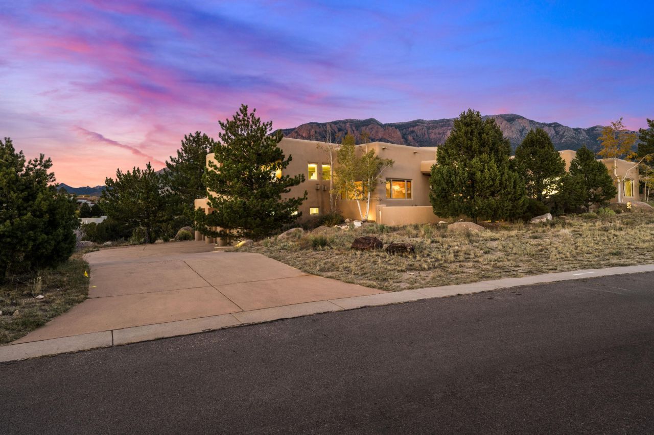 Enjoy the best of the High Desert lifestyle from this exceptional custom home, perfectly positioned to capture stunning views of the Sandia Mountains and the city lights. Step outside your front door to an extensive network of trails ideal for hiking, and walking. This classic Southwest residence showcases exquisite craftsmanship throughout, including furniture-grade cabinetry, custom wood doors, hand-troweled plaster walls, a stained-glass entry surround, reclaimed hardwood floors, and beautiful beamed ceilings. Three bedrooms feature en-suite baths and walk-in closets, offering comfort and privacy. Designed for outdoor living, the home features two tranquil water features, an outdoor kitchen, a cozy fire pit, and a spacious covered portal perfect for enjoying the breathtaking view.
