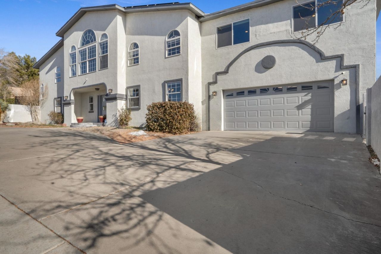 Architecturally striking and filled with natural light, this custom contemporary offers over 3,700 sq ft of flexible living in the Sandia foothills. A dramatic central living room showcases soaring cathedral ceilings, a sleek gas fireplace, and floor-to-ceiling windows with Sandia Mountain views and Westside sunsets.The modern kitchen features stainless steel appliances, a built-in gas cooktop with vent hood, and recessed lighting, flowing into the dining area for entertaining.Front and rear lofts overlook the living space, ideal for an office, gym, or studio. The layout includes four bedrooms, one full bath, two 3/4 baths, and a large recreation room. Situated on a generous corner lot with rare backyard RV access and solar panels, this home blends modern design, flexibility, and value.