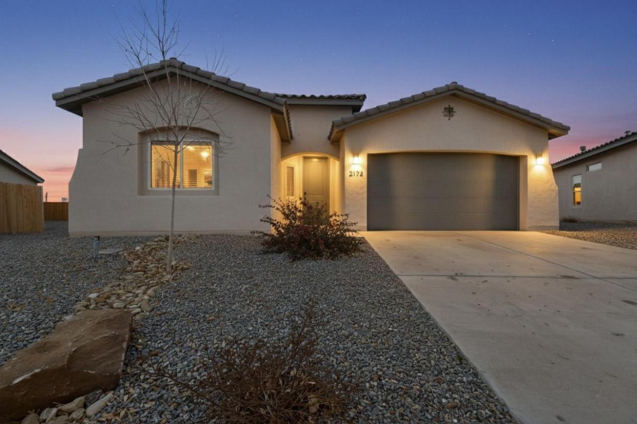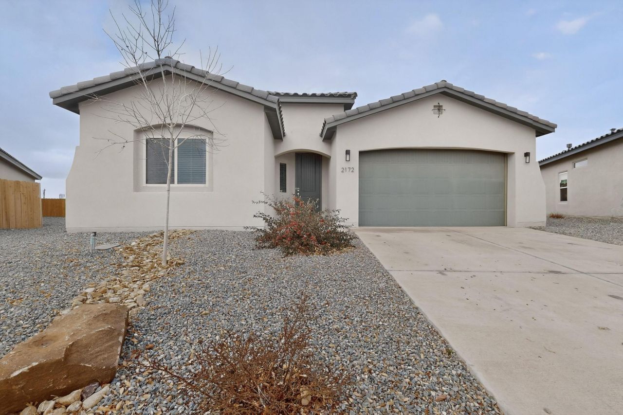 Looking for a newer home without the wait? This move-in-ready 2022 Abrazo Home is located in the desirable Solcito neighborhood of Rio Rancho, close to shopping and restaurants. Featuring refrigerated air, the home includes window coverings, all appliances, a covered rear patio, and full landscaping. The gorgeous kitchen opens to a spacious great room with dining and patio access--perfect for everyday living and entertaining. A third bedroom or front office offers flexible space. Situated on a large lot, this home is ready for you to move in and enjoy!