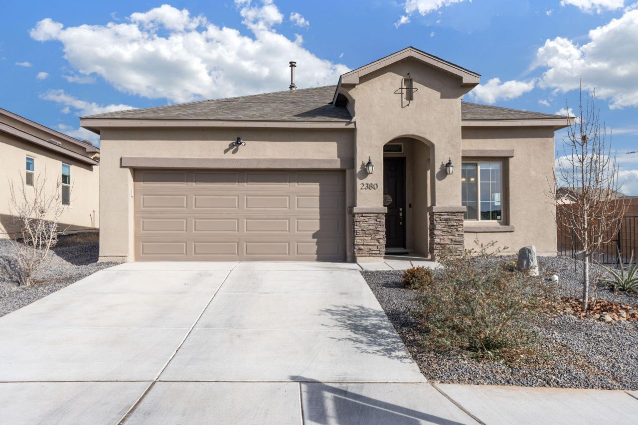 Beautiful 3-bedroom, 2-bath home built in 2024 with modern finishes and a functional open-concept layout. The kitchen features granite countertops, stainless steel appliances, ample cabinetry, and a large island with seating. Tile flooring runs through the main living areas, with comfortable bedrooms offering privacy. The primary suite includes a walk-in closet and an en-suite bath with a walk-in shower. Enjoy a fully landscaped, low-maintenance backyard with gravel and turf, perfect for relaxing or entertaining. Additional features include refrigerated air, a finished two-car garage, and a convenient Rio Rancho location near parks, schools, shopping, and dining.