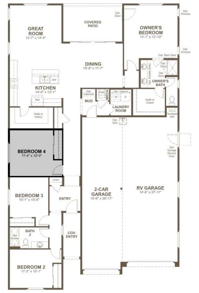 Highlights of this ranch-style Copper plan include a flex room that has been converted to a fourth bedroom, a well-appointed kitchen showcasing a walk-in pantry and a center island, an open dining area and a generous great room. A covered patio offers ample opportunities for entertaining while an impressive owner's suite provides residents with the ability to enjoy privacy and quietude. You'll have no shortage of space for parking and storing your vehicles with a 2-car garage and an RV garage. This home includes a garage service door, cabinets in the mudroom and laundry room and double sinks in the owner's bath.