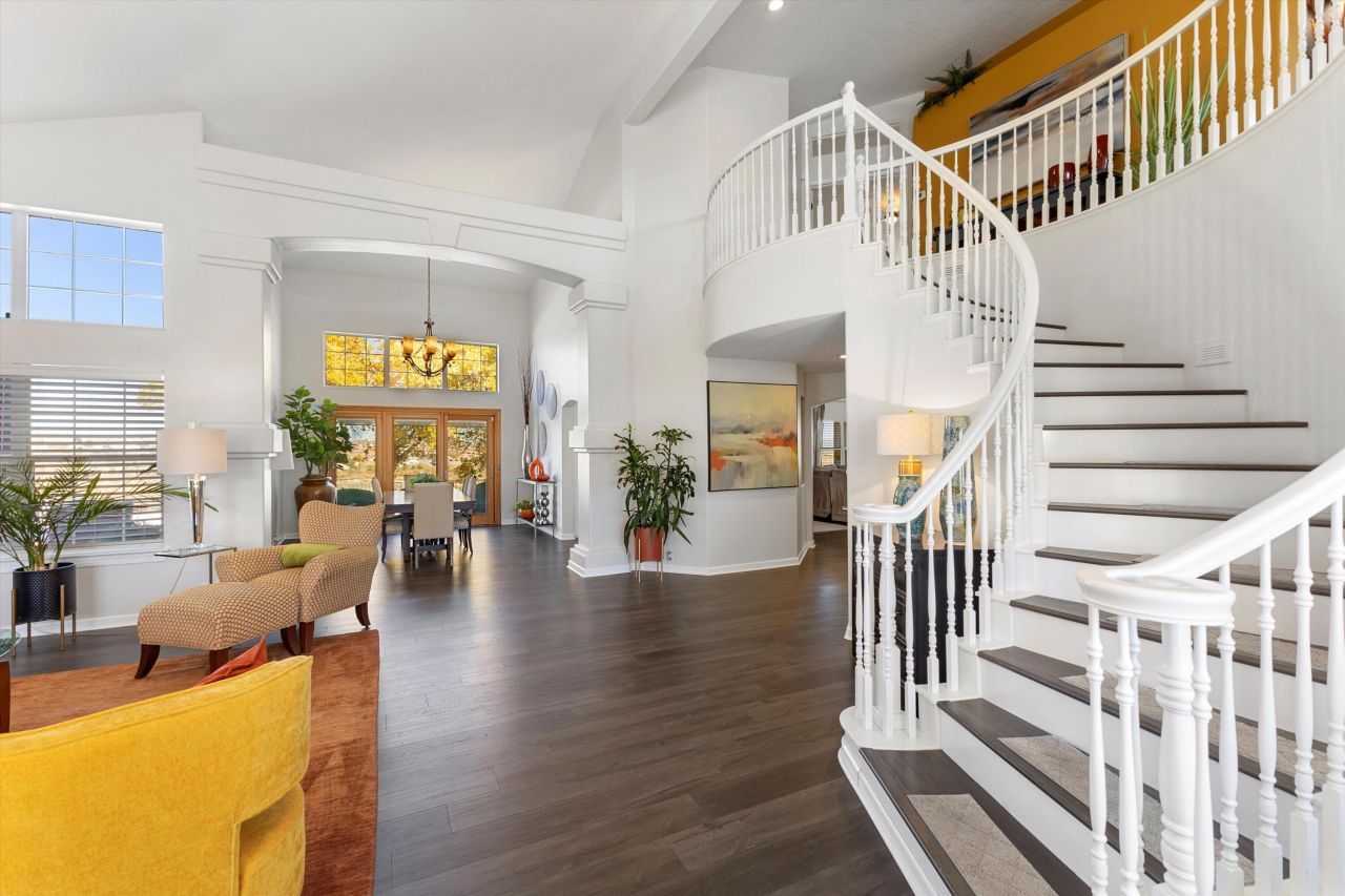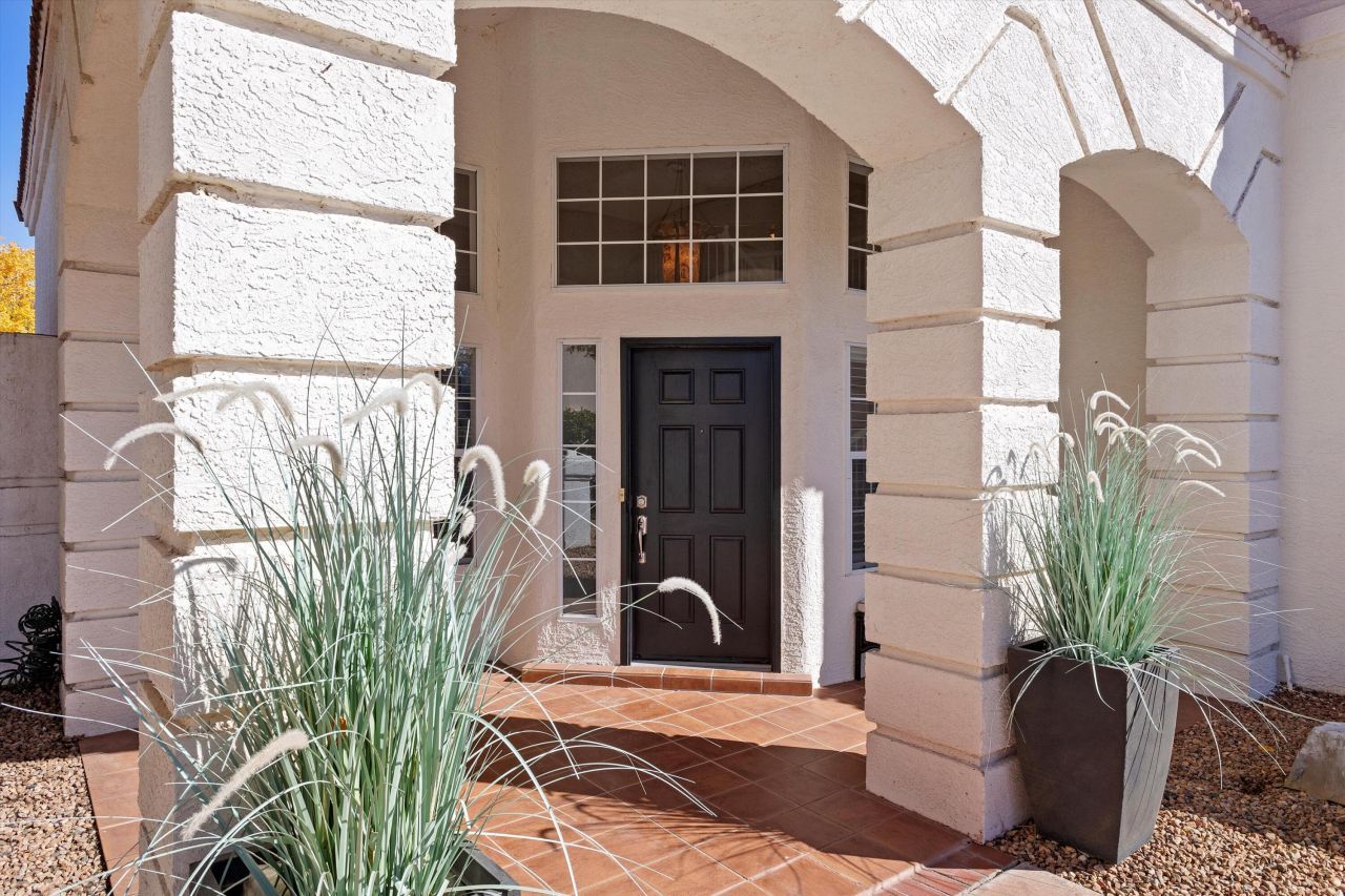 CAPTIVATE YOUR SENSES IN THIS LIGHT-FILLED RIO RANCHO RETREAT. This two-story home offers an inviting flow with high ceilings, a dramatic staircase, two living areas, formal dining, a warm fireplace, and an open kitchen with island and bar seating. The downstairs office can double as a fourth bedroom with a nearby three-quarter bath. Upstairs, enjoy a spacious loft, three bedrooms, and a grand primary suite with an XL walk-in closet, two-way fireplace, jacuzzi tub, shower, and private covered balcony. The backyard frames stunning Sandia views with protected open space behind. This property has been loved and well-taken care of! Additional features include rear storage area with electrical and separate ladder storage, gas line to fire table, 220 outlet on West patio. Come See it Today!